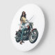 This is a digital illustration of a confident woman standing next to a classic red and silver motorcycle. The woman has long, wavy brown hair, wears sunglasses, a beige short-sleeved top, and blue jeans rolled at the cuffs. She is barefoot, with a casual yet stylish demeanor. The background features a stylized orange sun, giving the image a retro, 1970's-inspired vibe. The motorcycle has a polished chrome finish and detailed engine components. The overall style is reminiscent of comic book art, with bold lines and vibrant colors.