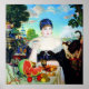 Lady Drinking Tea with Cat. Oil on canvas from 1918. One of the great commercial and art nouveau painters working in Russia, Boris Kustodiev employed a style that emphasized bright colors, sharp figures and striking landscapes. This is one of his most charming paintings which features a merchant’s wife drinking tea before a rich table set with watermelon, fruit, bread and beautiful pewter ware. A happy cat rubs up against her shoulder. The woman wears a pretty blue bonnet and the summer in Moscow is warm with a bright sky. A great gift for fans of Boris Kustodiev, Russian Art, cat paintings, and art nouveau.