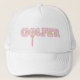 Typographical golf hat in a green and pink Arygle style golf pattern. Reads: Golfer. Perfect to keep the sun off lady golfers whilst on the green. Uniquely designed by Sarah Trett.