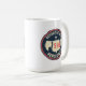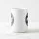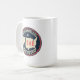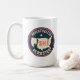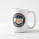 Support the voice of women in America with an anti Trump coffee mug! Iconic round logo symbol design with the Statue of Liberty over a map of the USA. Perfect classy mug for feminist activists. Blue, cream, and red colors. Elizabeth Warren power quote with your morning brew: Nevertheless She Persisted
