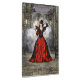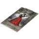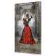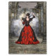 3D digital render of a beautiful female wizard in a red and black dress with wings on a fantasy spooky castle background