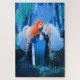 The digital illustration depicts a beautiful young lady with a with red curly hair. She wears a long dark cape and the seals of a knight, and she holds a shining sword in her hand. With the other hand she hugs a calm white horse with a magical beautiful mane. They are surrounded by a mysterious evening forest