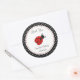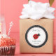 Round sticker for birthday favor with ladybug theme and red-black color combination.