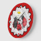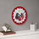 Cute, whimsical art featuring mom, dad and baby ladybug out for a stroll in the garden. Mrs. Ladybug has a daisy flower umbrella. Wavy edge red border. Larger red dots show positions of 12, 3, 6 and 9. Smaller red dots indicate the other hours in a day.