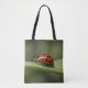 Bring a touch of nature's charm wherever you go with this beautiful tote bag. Featuring a vibrant red ladybug perched delicately on a green stem The photograph captures the beauty of the outdoors, making it a thoughtful gift for nature lovers and insect enthusiasts alike.