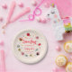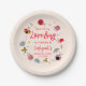 Cute ladybug theme birthday party plate featuring illustration of cute red and pink bugs with wildflowers. The text says "our little lovebug is turning X."
