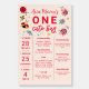Cute ladybug theme kid's birthday party milestone board featuring illustration of red and pink ladybugs with wilflowers. List all the important birthday stats, fun and quirky things they've learned, and the things they have grown to love!
