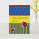 A modern birthday card design with a Happy Birthday greeting on the front in ukrainian. The example name is ready for you to personalize - just type in the boxes. The color scheme is red, yellow and blue. There are ladybugs and stripes patterns on the front and a ladybug and a pattern of scattered hearts on a pale yellow background inside. Whether you call them ladybugs or ladybirds, they are symbols of good luck, so send some lucky birthday wishes to someone you love!