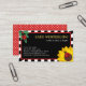 Cute mom calling card for your playdates with your name in big bold yellow letters, and your contact info in a fun white font. Add your children's names in a charming script. All against a black background framed by a red border and black and white stripes. A ladybug sits on a bright yellow sunflower in one corner, and another ladybug sits on a green twig of leaves in the opposite corner. The back features red and white polka dots.