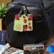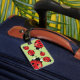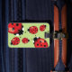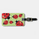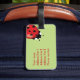 This luggage tag features Destei's cartoon ladybugs on a green background color. On the back side there is a personalizable text area for contact information.
