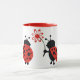 Whimsical combo mug with a pair of ladybugs and a flower in red, black, and white.