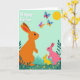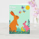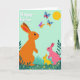 This card shows a spring scene with three stylized rabbits 🐰 in warm orange, soft pink, and sunny yellow lined up along the lower edge, leaning toward one another as if sharing a quiet, friendly moment. The larger orange rabbit stands to the left, looking right toward the pink rabbit and the tiny yellow one close behind, their simple faces and close spacing suggesting affection and togetherness. Around their feet, leafy green plants spread across the ground with small white and yellow flowers tucked between the stems. Above them, a mint-green sky opens up with a round yellow sun and three delicately winged insects drifting across in blue, pink, and purple. In the top-left corner, the words “Happy Easter” appear in white lettering, set against the open sky for easy reading. Darker green leaves frame the sides, creating a natural border that draws your eye back to the rabbits and the blossoms 🌷. Fine line details show patterned wings on the insects and layered leaf shapes edging the scene. The pink insect hovers near the sun while the blue and purple ones float slightly lower over the mint-green background.