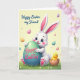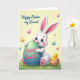 This card shows a soft spring scene with a white bunny in the lower center, looking up with big blue eyes and a small rosy smile, as if sharing a quiet, friendly moment 🐰. Its tall ears are lined with pink, and its paws wrap around a large teal egg like a gentle hug. On the teal egg, a bright pink greeting appears in flowing cursive-style lettering, centered and easy to spot. To the side, a tiny yellow chick peeks out of a cracked shell among green grass, with little white and yellow flowers tucked between the blades 🌷. The background is a creamy yellow wash that feels like early morning light, giving the characters a tender, close-together look. Across the top area, a warm seasonal message is written in darker pink cursive-style text, stretching neatly from left toward the middle. Small glossy eggs in pink, lavender, and gold drift across the upper background, while the grass and blossoms stay gathered along the bottom edge.