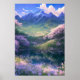 This digital artwork showcases a stunning lake nestled at the bottom of a green valley, adorned with pink flowers and cherry blossoms. The beauty of the scene is further enhanced by the presence of majestic snowy mountains on the horizon. The artwork invites the viewer to immerse themselves in the serene ambiance, envisioning the reflection of the surrounding beauty in the calm waters of the lake and appreciating the harmonious blend of colors and elements that nature has to offer.