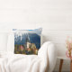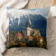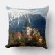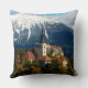 Photo throw pillow with the small Island with church surrounded by trees in fall colors in Lake Bled with in the background snow on the peaks of the Julian Alps in autumn in Slovenia.