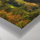 Canvas landscape print of a ferry boat on Lake Bohinj approaching the town Ribcev Laz with the prominent church in an autumn landscape with forests with trees in fall colors in Triglav National Park near Bled in Slovenia. Great decoration on your wall!