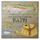 DESIGN COLLECTION: This artwork was hand painted in watercolor by Audrey Jeanne Roberts. Beginning with a background of aged cabin wall or fence boards with a great patina of age, a rainbow trout , an antique fishing creel and vintage lures a matched with a great saying for your favorite fisherman (or woman!) The text reads, "Good things come to those who BAIT!" Ideal for a lakeside cabin retreat home decor or a decor for those who wish they were at the lake!
