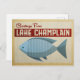 This Greetings From Lake Champlain vintage travel design features a fun blue fish with red accents and a 1960s retro vibe.