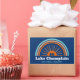 Adventure seekers visit the Lake Champlain area for paddling, hiking, fishing, and climbing in the warm months, and cross-country skiing, snowshoeing, and fat tire biking in the colder months. This retro design has a rainbow and canoe.