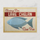 This Greetings From Lake Chelan vintage travel design features a fun blue fish with red accents and a 1960s retro vibe.