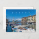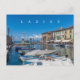 A beautiful view of the small harbor in the village of Lazise on Lake Garda in Italy printed on a postcard.