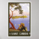 Classic Italian vintage travel poster advertising Lake Garda, the largest lake in Italy. It shows a lovely view of a calm and tranquil lake.