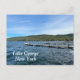 View of a dock on Lake George in New York with a view of the mountains in the background.