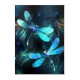 Two transparent, luminous, turquoise, artistically drawn dragonflies on night background with luminescent lake algae and fireflies. Glowing dragonfly.