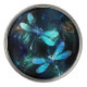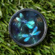 Two transparent, luminous, turquoise, artistically drawn dragonflies on night background with luminescent lake algae and fireflies. Glowing dragonfly.