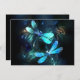 Two transparent, luminous, turquoise, artistically drawn dragonflies on night background with luminescent lake algae and fireflies. Glowing dragonfly.