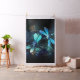 Two transparent, luminous, turquoise, artistically drawn dragonflies on night background with luminescent lake algae and fireflies. Glowing dragonfly.
