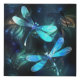 Two transparent, luminous, turquoise, artistically drawn dragonflies on night background with luminescent lake algae and fireflies. Glowing dragonfly.