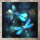 Two transparent, luminous, turquoise, artistically drawn dragonflies on night background with luminescent lake algae and fireflies. Glowing dragonfly.