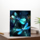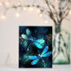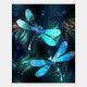 Two transparent, luminous, turquoise, artistically drawn dragonflies on night background with luminescent lake algae and fireflies. Glowing dragonfly.