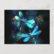 Two transparent, luminous, turquoise, artistically drawn dragonflies on night background with luminescent lake algae and fireflies. Glowing dragonfly.