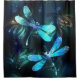 Two transparent, luminous, turquoise, artistically drawn dragonflies on night background with luminescent lake algae and fireflies. Glowing dragonfly.