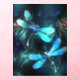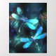 Two transparent, luminous, turquoise, artistically drawn dragonflies on night background with luminescent lake algae and fireflies. Glowing dragonfly.