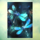 Two transparent, luminous, turquoise, artistically drawn dragonflies on night background with luminescent lake algae and fireflies. Glowing dragonfly.