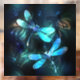 Two transparent, luminous, turquoise, artistically drawn dragonflies on night background with luminescent lake algae and fireflies. Glowing dragonfly.