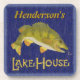 This drink coaster set is perfect for your lake house decor. It shows an original drawing of a bass fish about to bite a hook. The text says, "[Your Name] Lake House." The design is made in shades of blue, green, yellow and brown and includes a wave frame.