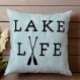 Our custom pillow adorned with with the words "Lake Life" in black on a soft blue/green background. View our full line of products in our Zazzle store.