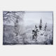 A photograph showing just a glimpse of the mountain lake through snow-covered fir trees. This landscape picture is digitally manipulated to look like a watercolor.