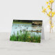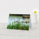 On the front of the card is an intensely colored lake scene with ducks paddling, cattails and other marsh flora in the foreground, and a covered fishing dock in the far corner.