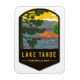 A vintage travel badge design of Emerald Bay, Lake Tahoe, a large freshwater lake in the Sierra Nevada Mountains located in California and Nevada.