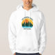Customized family lake vacation hoodie featuring the pretty blue waters under the forest of trees and cool orange sunset. Cute camping trip hooded sweatshirt for your nature outing or wilderness group.