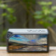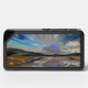 An art design of a lake with the dramatic sky reflected in the lake water. Hills and fields surround the lake.