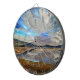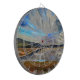 An art design of a lake with the dramatic sky reflected in the lake water. Hills and fields surround the lake.