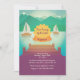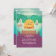 A scenic lake view invitation. The setting has a dock, blue-green water, sailboats and mountains in the distance.