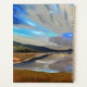 An art design of a lake with the dramatic sky reflected in the lake water. Hills and fields surround the lake.
