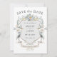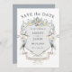 This unique nature-inspired wedding Save the Date design is a lovely choice if you are planning a lakeside or waterfront wedding. It has an interesting combination of a crested shield embellished with blue and white watercolor floral elements and greenery along with a pair of blue herons. Personalize the text template with your details. The back side of this card is shown in dusty blue.